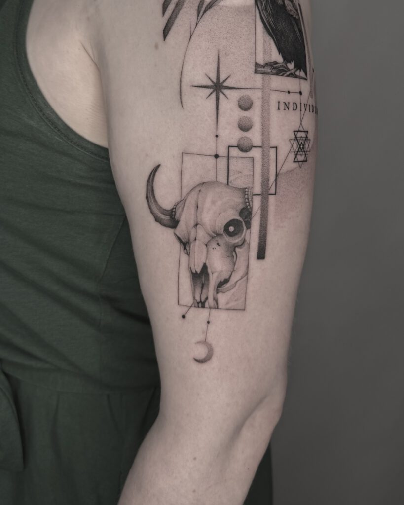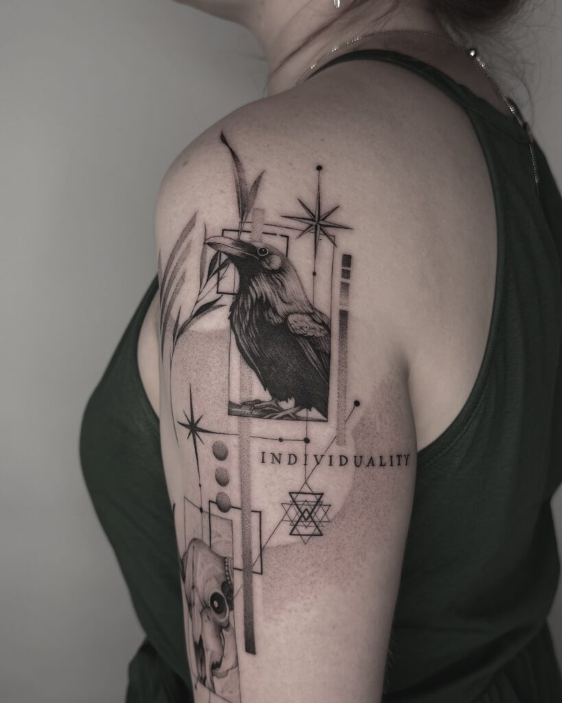Der Schriftzug „Individuality“ bringt die zentrale Aussage des Tattoos auf den Punkt: die Bedeutung, den eigenen Weg zu gehen und eigene Lösungen zu finden. Er steht für Selbstbestimmung, persönliche Entwicklung und die Freiheit, anders zu sein.